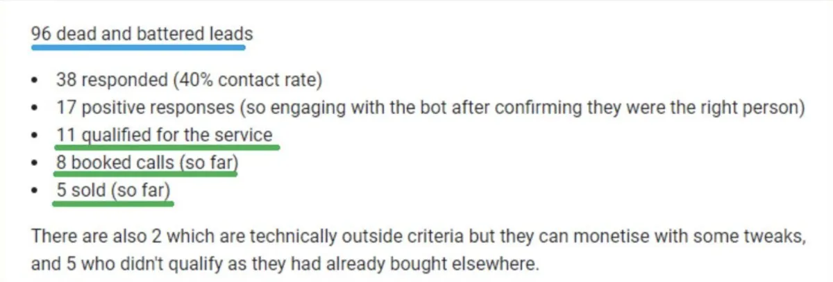 96 leads. 12 months old. Written off completely. Here's what our AI recovered. If your CRM has leads sitting unworked, there's a good chance revenue is recoverable. Book a call to find out — no cost, no obligation.